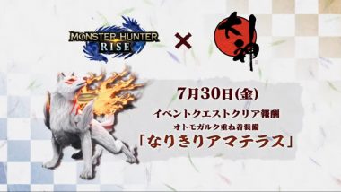 カプコンは7月27日、『モンスターハンターライズ』の無料タイトルアップデートVer.3.2の内容を発表した。同アップデート内のCAPCOMコラボ第2弾となるイベントクエスト報酬として、『大神』の主人公である「アマテラス」のコスチュームが登場するという。