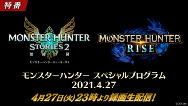 カプコンは4月23日、録画生放送番組「モンスターハンター スペシャルプログラム 2021.4.27」を4月27日23時より配信すると発表した。『モンスターハンターライズ』新情報などが公開される。