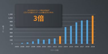 Valveは4月8日、「Steamにおける新規リリースの販売成績」と題して、Steamの成長が新しいタイトルに及ぼす影響を投稿した。ここで示されたのは、2005年から2019年にかけて、リリース後最初の2週間の収益が1万ドル(約108万円)以上に達した、有料で販売されているゲームの数である。