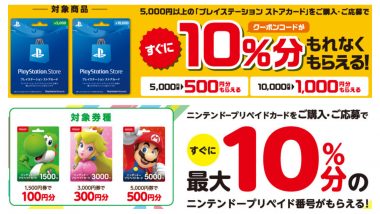 ファミリーマートにて、PSストアカード/ニンテンドープリペイドカードを対象とした、期間限定キャンペーンを実施中。ファミリーマート各店舗で対象金額のプリペイドカードを購入後、一連の応募をすることで、最大10%分のクレジットを追加でもらうことができる。
