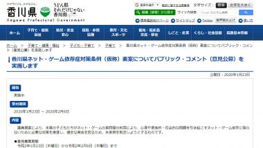 香川県は1月23日、「香川県ネット・ゲーム依存症対策条例(仮称)素案」について、パブリックコメントの募集をスタートした。