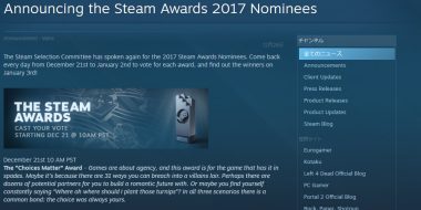 今月12月20日、Valveより2017年度「Steamアワード」の最終ノミネート作品が発表された。受賞作を決めるユーザー投票は、太平洋標準時で12月21日午前10時から開始される。投票期間は太平洋標準時で12月21日から1月2日までとなっており、毎日異なるカテゴリで最終投票が実施される予定だ。