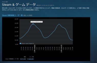 PCプラットフォームSteamの同時接続ユーザー数が1750万人を突破した。同プラットフォームを運営するValveが公開している統計情報ページにて、その数字が確認できる。グラフを見てみると、11月25日の23時に1760万人のものユーザーがSteamにログインしていることがわかる。