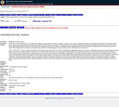 米国特許商標庁のデータベースより、カプコンが『Monster Hunter: World』なる商標を出願していたことが明らかとなった。商標は2017年6月5日に出願されたもので、コンピュータゲームやビデオゲームなどの区分となっている。