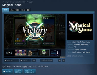コミュニティの投票により本リリースが決定されるSteam上のシステム「Greenlight」に3月31日、対戦落ち物パズルゲーム『Magical Stone(マジカルストーン)』が登場した。『Magical Stone』は『ぷよぷよ』のe-Sports化を目指すという題目のもとにGameFactory社が発表した『ぷよぷよ』クローンゲームだ。