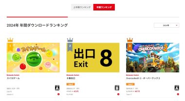 任天堂は12月27日、「Nintendo Switch 2024年 年間ダウンロードランキング」を公開。1位は2年連続で『スイカゲーム』がランクイン。2位には『8番出口』がランクインするなど、さまざまなソフトが名を連ねている。