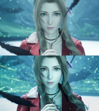 エアリスが祈るスクリーンショットを見るだけでも、ライティングの調整の恩恵が大きいことは報告されている。このシーンを見るだけでも、PS5との違いが見て取れる。