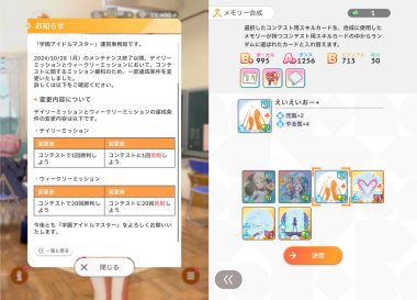 バンダイナムコエンターテインメントは10月28日、『学園アイドルマスター』にてVer.1.6.0アップデートを実施。コンテスト用のメモリー合成機能など、メモリー関連の機能が拡充されたほか、バランス調整もおこなわれている。