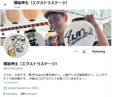 上海アリス幻樂団のZUN氏は9月27日、新しいX(旧Twitter)アカウントの作成を報告した。同氏のX(旧Twitter)アカウントは、9月24日ごろより乗っ取り被害にあっており、そうした事態への対応として、新アカウントが作成された。