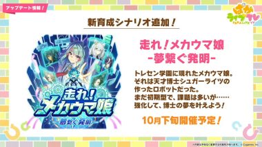 Cygamesは9月27日、『ウマ娘 プリティーダービー』の新育成シナリオ「走れ!メカウマ娘-夢繋ぐ発明-」を10月下旬に実装すると発表した。天才博士の作ったメカウマ娘を強化して、博士の夢を叶えることになるそうだ。