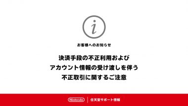 任天堂は7月24日、「決済手段の不正利用およびアカウント情報の受け渡しを伴う不正取引」に関して、同社サポートを通じてユーザーに対し注意喚起をおこなった。