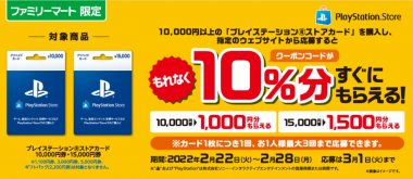 ファミリーマートPSストアカードを対象とした期間限定キャンペーンが開始されている。PSストアカードを一定額買うと、さらに10%分ついてくる。