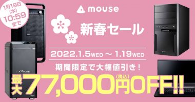 マウスコンピューターは自社通販サイトにて、1月19日10時59分までの期間限定でWEB限定の新春セールを開催中。期間中はモデルによって最大7万7000円オフで販売されるお得なセールだ。台数限定。