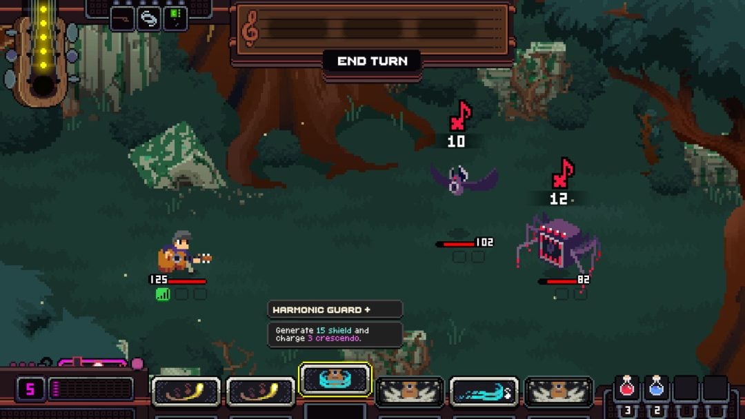 さて、私が選んだのは『Fretless – The Wrath of Riffson』である。一人のミュージシャンが悪のレーベルの陰謀に立ち向かうという、それほど長くないRPGだ。グラフィックはかわいいドット絵調で、どこもかしこも音楽にちなんだモチーフが散りばめられている。ミュージシャンがバトルするとあって、楽曲も素晴らしい出来だ。ただ、私はこのゲームを始めた最初の1時間ほど、それほどおもしろいとは感じなかった。どの要素も良い出来だが、肝心の戦闘はただのコマンドRPGのように思えたのだ。その評価はすぐに覆ることになる。