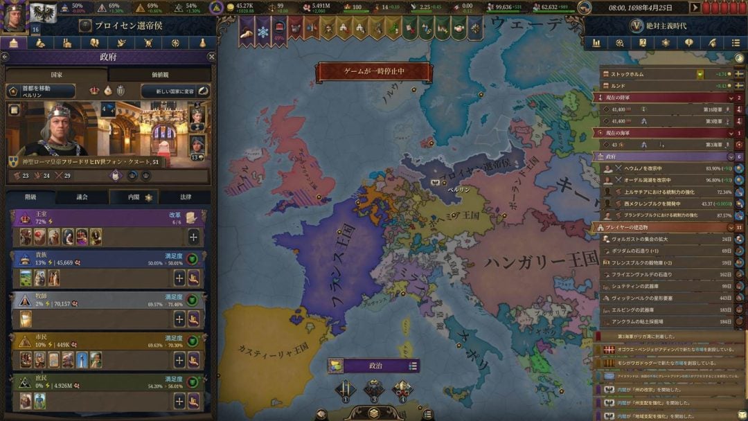 そしてゲーム内には大量のパラメーターが存在しており、互いに複雑に絡み合っている。どんなプレイヤーも圧倒してしまうほどだが、『EU5』は広範にわたる自動化機能を導入し、本作をゲームとして成立させている。特に数千のロケーションをもつ大勢力を操作する場合、一つ一つのロケーションを手動で日々管理するのは、現実的に不可能だ。本作の自動化はただのオプションではなく、プレイヤーの注意力というリソースを管理するための、ゲームの根幹的なシステムとして機能している。