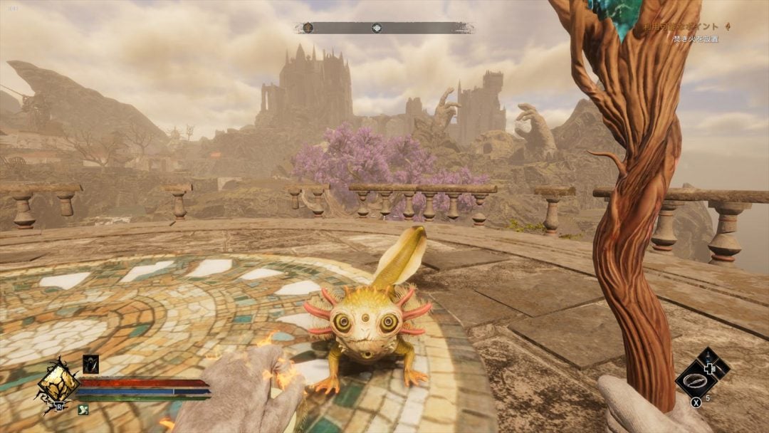 大岩に磔にされた巨人が鎮座する村や、血の池の底に隠れた洞窟など、少し進むごとに異質な何かが表れる高密度のフィールド。そして膨大な種類のユニークアイテムがちりばめられた世界は、どこへ行っても「手ぶらで終わる」ことを許さない。ハイペースで見つかる装備や魔法はいずれもプレイスタイルを変えうる多様性があり、「試すのが追い付かない」という贅沢な悩みも生まれる。“敵をチーズに変える攻撃魔法”、“多眼爬虫類の赤ちゃん”など実用性のないものも大量に存在し、違う角度から好奇心を刺激してくる。