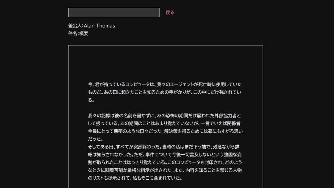 本作でプレイヤーは、あるエージェントが使用していたというコンピューターを入手し、怪奇事件を追っていく。なぜ、Galley Houseには大量の死体があったのか。どうして、彼らは死亡したのか。そもそも、彼らはどこの誰なのか。本作では謎だらけの怪奇事件を巡る、壮大なミステリーパズルが繰り広げられる。なお本稿では仕組みから探る作品の性質上、基本的に内容を開始5分程度で得る情報にとどめているが、あらすじで興味を持ったのなら、無料なので先を読む前にプレイしたほうがいいかもしれない。本作は、いずれも推理ゲームである『Return of the Obra Dinn』『Her Story』などからインスピレーションを得ており、これらの作品が好きだったのならきっと本作も好きになるだろう。リマスター版も登場予定となっている。