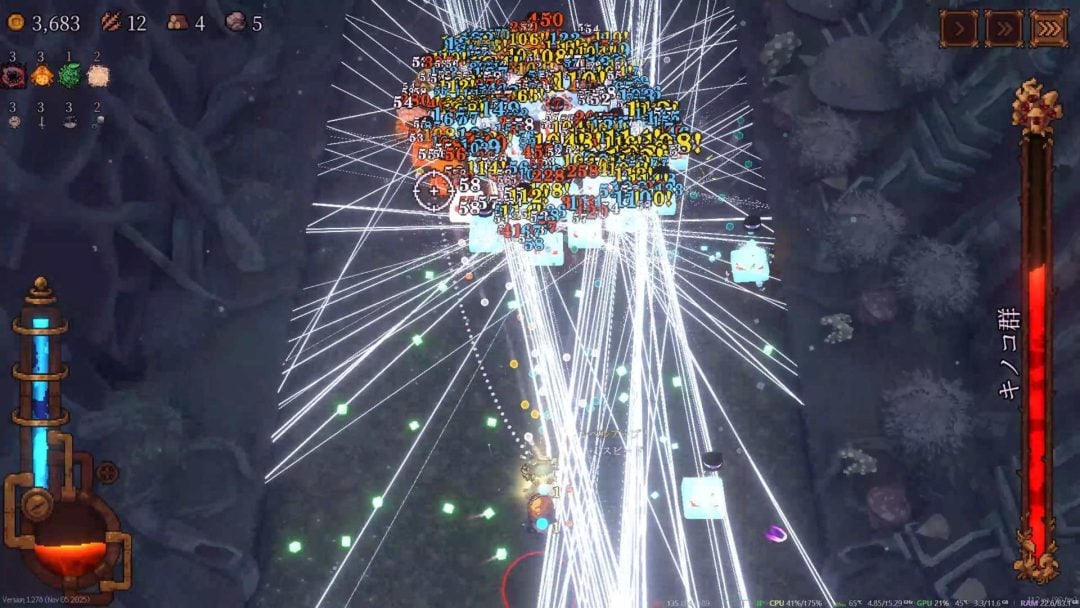 ここまでであれば、“欠点のないブロック崩し”どまりだ。しかし本作ではこの核となるゲームプレイに、ローグライト要素が組み込まれることで変化が生まれる。武器となるボールのランダム取得および合成により、毎回異なるビルドが構築され、従来のブロック崩しとは逆に時間の経過とともに快感は増していく。また、キャラクターごとにシステム自体が変化し、2人を組み合わせて挑めるため、立ち回りもその都度異なるものとなる。拠点建築による永続強化や敵が強くなるNG+も用意され、画面は派手になりつつも歯応えは失われない。これらすべてが遊べば遊ぶほど魅力が薄まるブロック崩しと対照的に、プレイを続けさせ、もう一度とプレイさせる強烈な中毒性へとつながっている。
