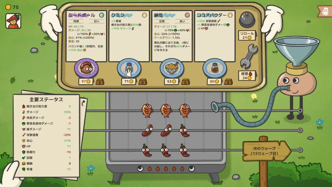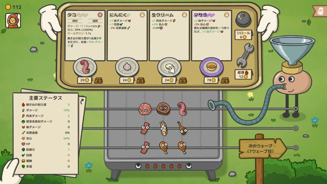 本作は、串焼きをモチーフとしたローグライト・タワーディフェンスゲームだ。さまざまな食材をグリル上に並べて、押し寄せてくるネズミを撃退する。本作の主役となる食材たちには肉や海鮮、野菜などさまざまな分類が存在。またそれぞれ、しょっぱい・辛い・甘いなどの味わいが設定されている。それぞれの分類や味に特化したビルドを構築し、自分が思う最強のグリルを作り上げていく。