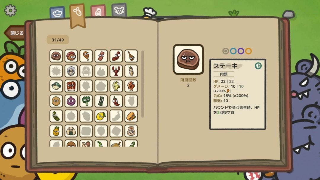 ステーキの処遇はともかく、一度クリアしたことでさらなる高難易度が解禁されたほか、複数の焼き師がアンロックされた。魚が発射する弾丸を増やす「弾丸魚」や、肉系食材を所持できない代わりに野菜系食材のダメージを大幅強化する「白菜同好会」など、名前も性能もクセが強い焼き師たちが登場している。次のプレイは悩みつつ、「塩振りおじさん」をチョイス。塩味の食材を強化するようなので、食材の種類ではなく味付けに焦点を当てた“しょっぱい味”ビルドということになるだろう。