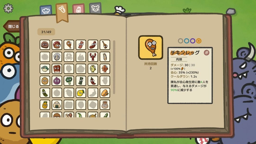 また、肉系の食材は“会心”にまつわる特殊効果をもっているものが多い。たとえばシューター系の「チキンレッグ」は会心発動時に弾丸が敵一体を貫通する。また防御系の「ステーキ」は会心発生時にHPが3回復する。クリティカル率をアップする系の調味料を集めるとシナジーがあるのは間違いない。会心率を上げる調味料は油類だったので、油・豚脂・牛脂などを手当たり次第にぶち込んでいく。胃もたれがしてくる。