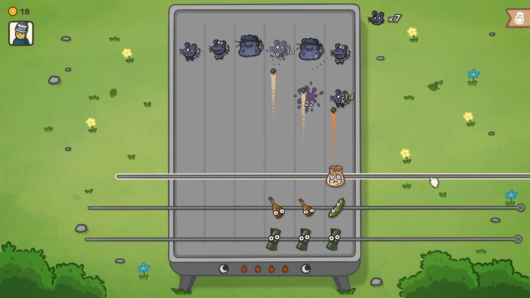 一般的なタワーディフェンスゲームはプレイ中の操作量が比較的少ないイメージがあるが、本作は串の操作で結構忙しい。一本の串には3つまでしか食材を刺せないが、ネズミが出現するレーンは6つある。放置しているとフォローしきれないのだ。