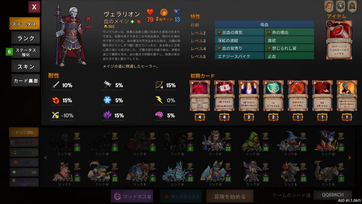 ヴェラリオンは半吸血鬼であり、呪われた城のなかで血の魔法を叩き込まれ闇落ちしかけたというヒーロー。固有デッキにもそのダークなエッセンスがしっかりと反映されている。固有カードには、ターン毎にスタック分蓄積ダメージを与える効果「出血」と、本DLCから追加された新たな効果「寄生」、2つの効果を持つカードを多く有している。