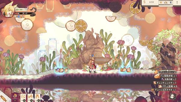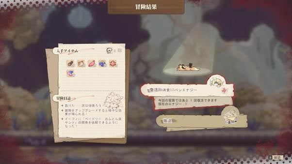 さらに、ボスを倒すかチャヤが倒れるとその日の探索は終了なのだが、倒れてもペナルティはいっさいなく、それまでに得た食材はすべて持ち帰れる。もっと言えば、パン屋経営で貯めた「パンエナジー」があればその場で復活もできる。