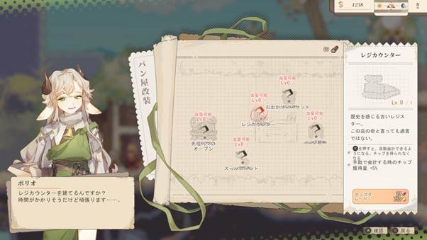 なお、店員をずっとやっていると「レジ打ちが面倒だな」とか「並べられる商品をもっと増やしたいな」とか「もっとひとりのお客さんがまとめて買ってくれたらいいのにな」とか思う瞬間が出てくるのだが、それらはすべてボリオへの依頼による施設開発によって解決できるようになっている。