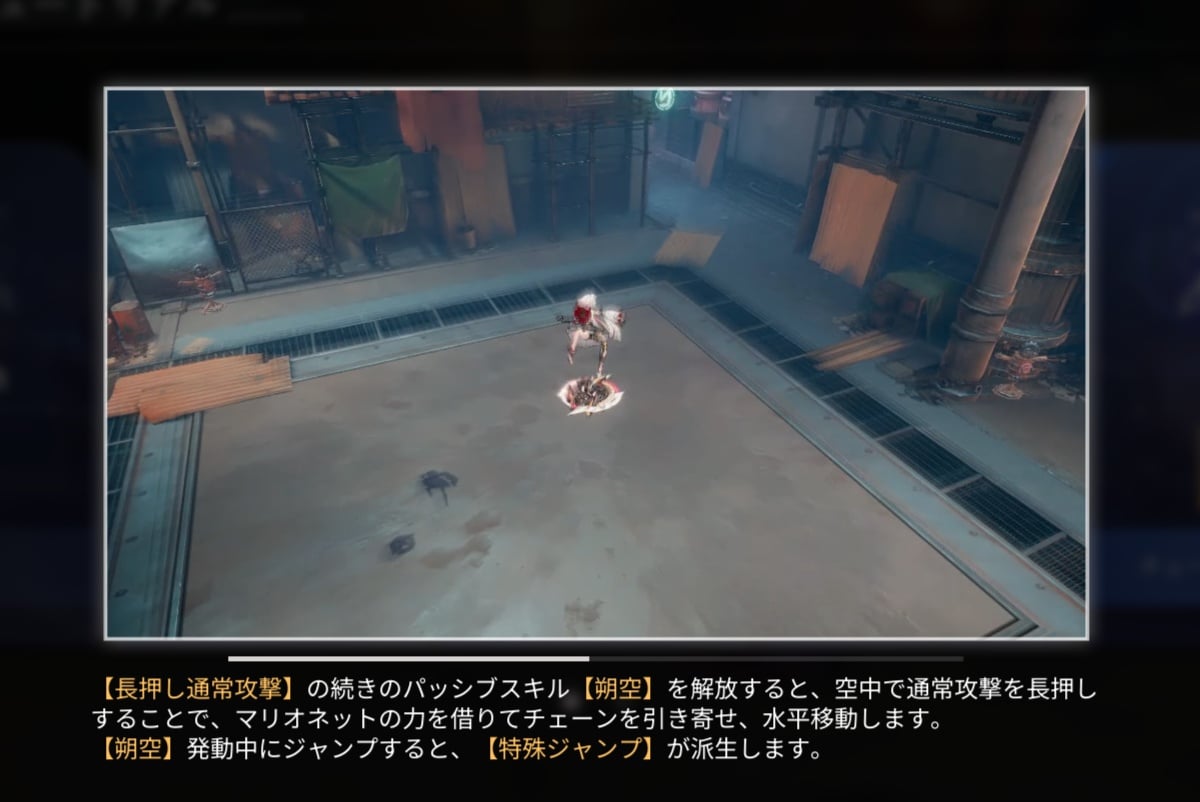 本作では空中で通常攻撃を長押しすると本来は落下攻撃が発生する。対してグレイシエッタは、空中での通常攻撃長押しが前方へワイヤーを飛ばして移動するスキル「朔空」へと変化する。しかも移動した先でも朔空を何度も発動できるため、実質的に空を飛ぶような空中機動が可能となるのだ。これまではジャンプや空中回避を駆使してようやく届いていたような足場でも、グレイシエッタであれば朔空を連発するだけでいとも簡単に到達できるようになる。あたかもゲームシステムを壊してしまったような爽快感を味わえる。地形によっては探索効率が劇的に向上するだろう。