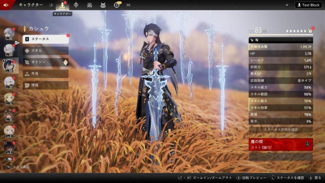 一方のカシュウは光属性のアタッカーで、あらゆる武器を使いこなす。本作では全キャラがすべての武器を装備できるが、いちおう各キャラに得意な武器種というものが設定されており、対応する武器はダメージが少し上がる。しかしカシュウの得意な武器種は、本作初となる「全タイプ」。武芸百般の達人というキャラ設定が反映され、すべての武器の性能を引き出せるキャラになっている。