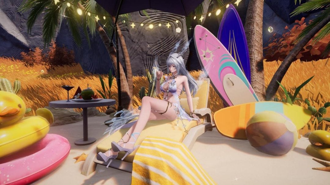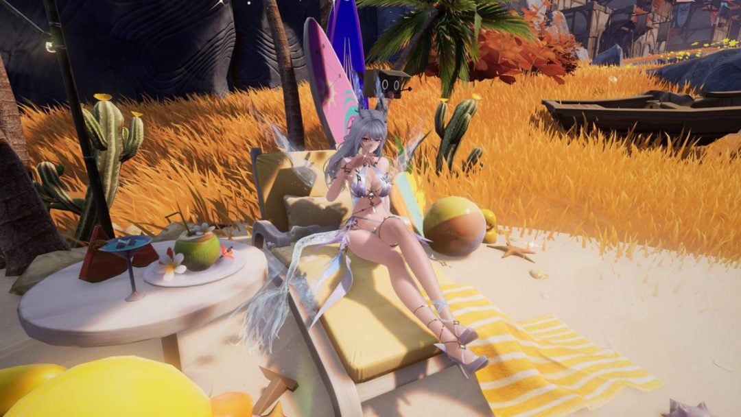 また新アップデートでは、新たなスキンもいくつか登場する。ちなみに本作のスキンは性能には一切影響しないため、見た目のみの要素である。注目されるのは、フーシュ用の限定水着スキンが同梱されたスキンガチャだろう。同ガチャには南国リゾートをイメージしたアイテムが詰め合わされており、なかでもジェスチャーの「海辺の戯れ」は、くつろぎビーチ空間をその場にまるごと呼び出すという豪快なものだ。