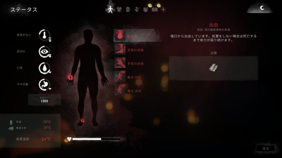 だというのに、こともあろうにウィルは墜落時に大怪我をしてしまい、寒さに対処するよりまず左手のど真ん中を貫通した飛行機の破片を引き抜いて(これが最初に入手する「ナイフ系」アイテムとなるのは最高のセンスだと思う)止血しなければならない。手首や足首の捻挫など後回しだ。ちなみにこうした現状を確認するためメニューを開いている間も身体は冷え、カロリーも血も失われていく。ウィルにとって、1分、1秒が命を賭けた戦いだ。