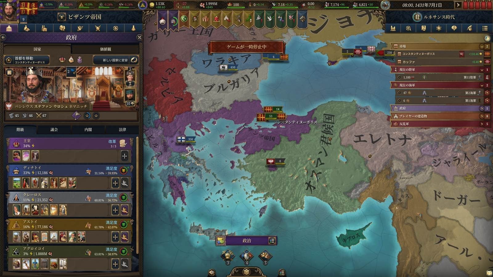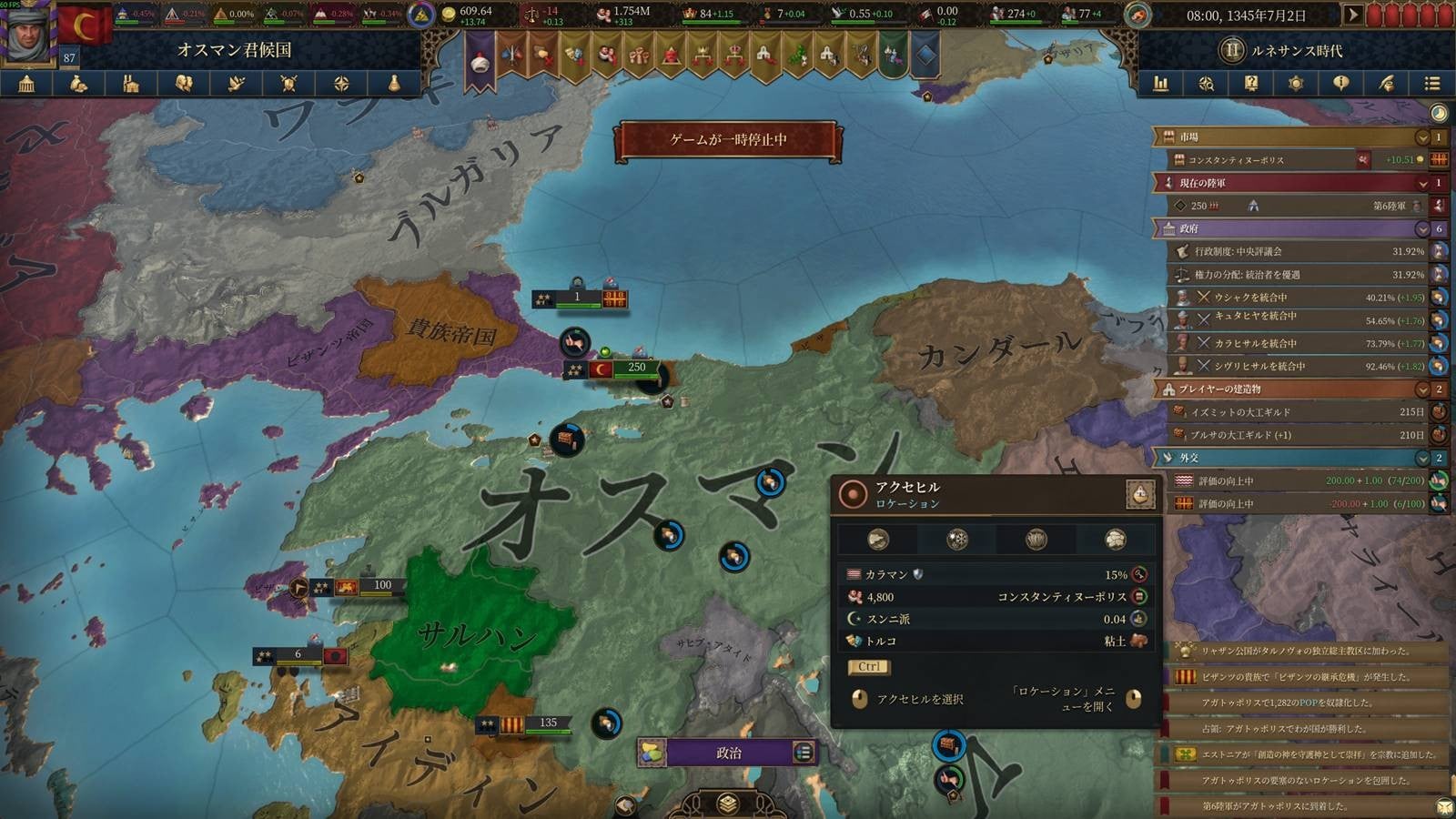 そしてもちろん選んだ国によって、プレイ感覚や方針も変わってくる。たとえばイングランドやフランスは百年戦争の開幕が目前に控えており、のんびり内政をしている暇はない。逆に日本は国内の大名らに対処しなければならず、序盤から海外に戦争を吹っ掛けるのは難しい。ビザンツ帝国は開始時点で借金もちの上に政治は腐敗まみれで、目の前に絶好調のオスマンがいるという絶望的な状況だ。
