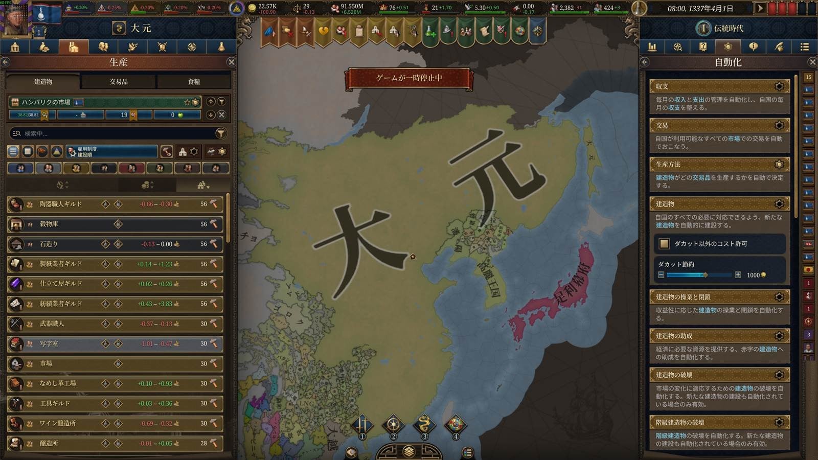 そして壮大さが『EU5』のひとつの特徴だとすれば、もうひとつの大きな特徴は自動化システムの存在だ。本作の自動化はオプションというより、ゲームの基本機能であり、コアのひとつ。プレイヤーがすべてを人力で管理するには広大すぎる世界を用意しつつ、ゲームとして成立させている手段なのである。