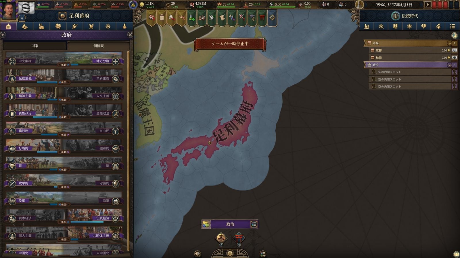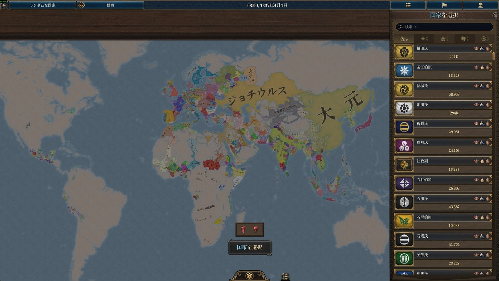 たとえば足利幕府でプレイしたとしても、プレイ目標は無数に考えられる。ユーラシア大陸に領土を広げるのか、アメリカ大陸に植民をするのか。それとも外征はせずに、ひたすら日本列島を豊かにするのか。何をしてもよいのだが、すべてを同時進行でするのは難しい。方針を決めるのはあくまでプレイヤーだ。