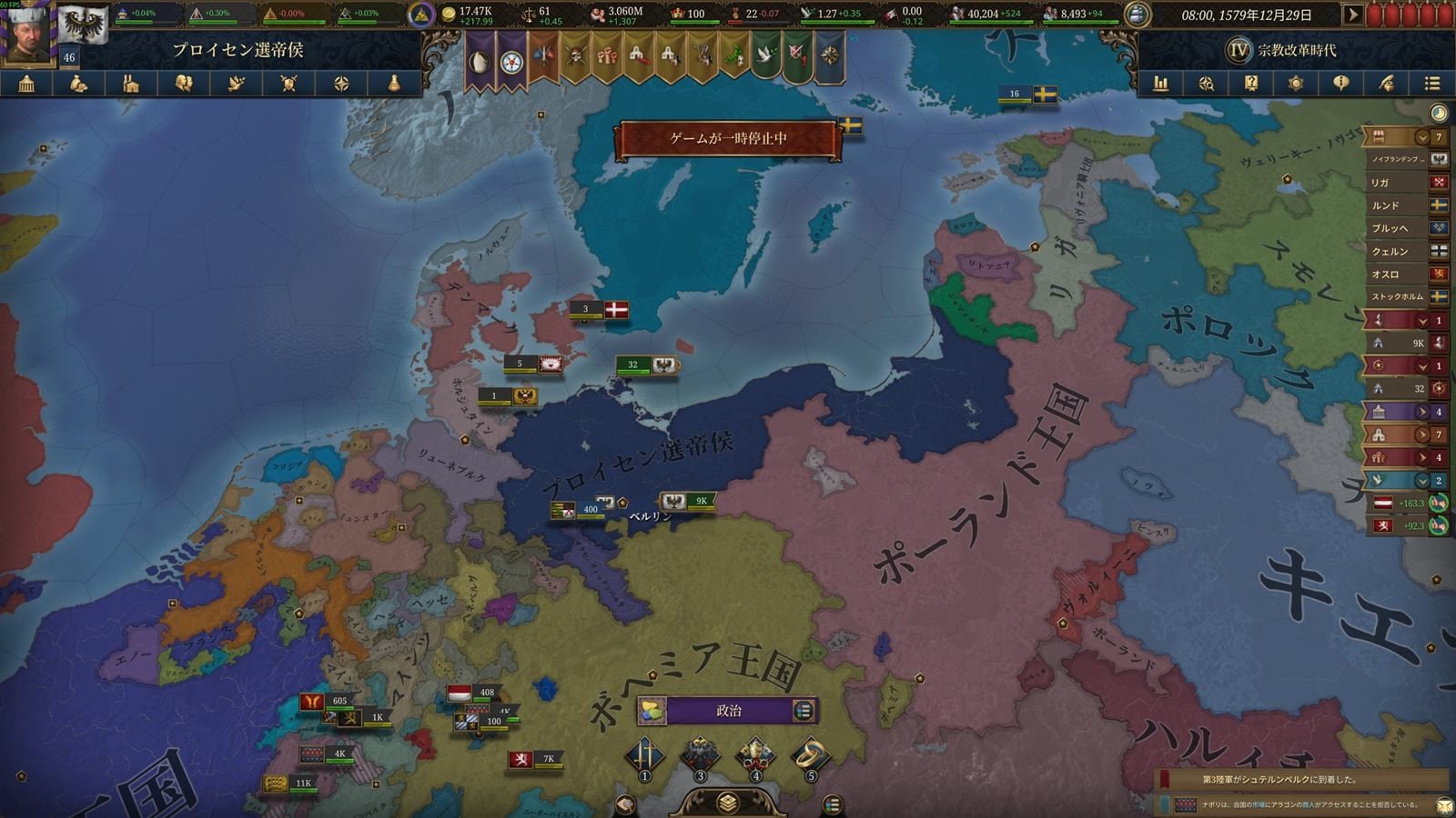 さらに本作には、各国に固有の歴史イベントが多数用意されている。たとえばブランデンブルクには61個の固有イベントがあり、当時の支配者であるヴィッテルスバッハ家のやる気のない統治と、荒れ果てた領地という問題に対処することになる。イベントの流れによって改革をおこなったり、あるいは史実通りホーエンツォレルン家を新たな統治者として招いたりするのだ。もちろんプロイセンになることも可能であり、歴史世界に存分に浸ることができる。