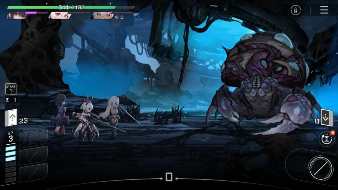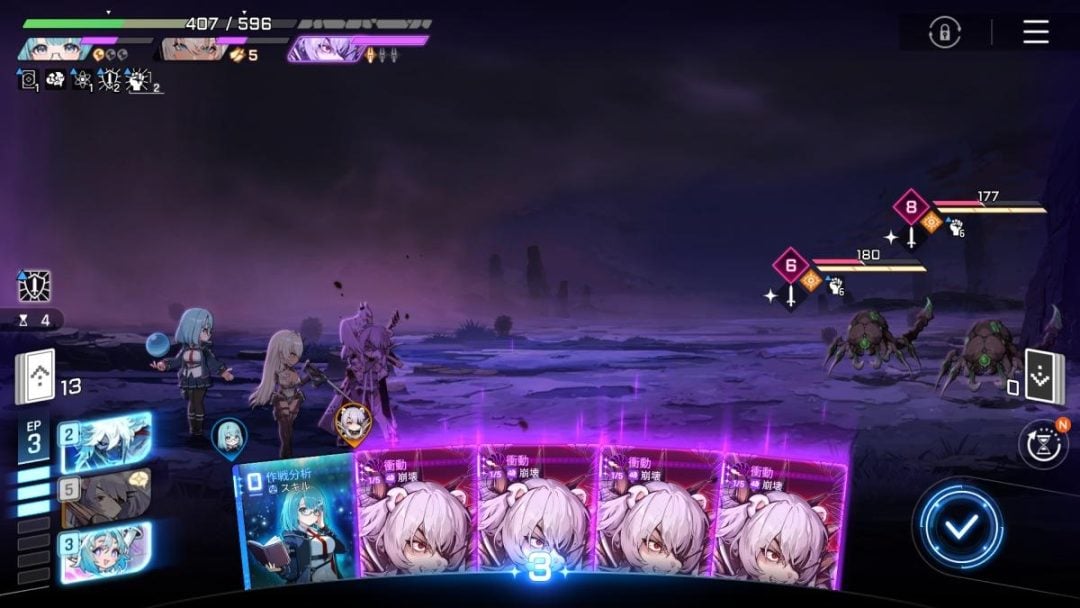 まず、キャラクターが精神崩壊するとその瞬間、全体の体力が3分の1減ってしまう。その時点でもかなり苦しいが、それに加えて精神崩壊したキャラクターのカードがすべて「崩壊カード」となるのだ。この崩壊カードの存在が厄介で、精神崩壊を解除するためには崩壊カードを使用しなければならない。使える手札が減るだけでなく、戦闘ではカードを使用するたびに敵の攻撃が早まるため、被ダメージリスクを背負うこととなる。1人の精神崩壊によって体力もリソースも一気に困窮してしまうのだ。