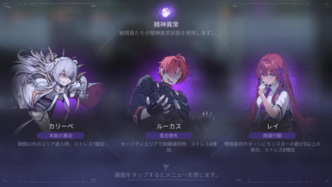筆者はヒラメキの爽快感からか、本作の戦闘に次第に夢中になっていった。しかし、ただ爽快なだけでないのが、本作の戦闘の手厳しいところ。本作においてカオスとは「触れると精神に異常を来すもの」とされている。そのため、カオス具現化では、敵に攻撃される度に「ストレス」が溜まってしまう。キャラクターにはそれぞれストレスゲージが設けられており、そのゲージがマックスになると、精神崩壊を起こしてしまうのだ。