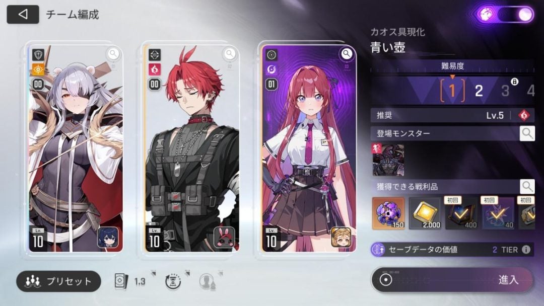 カオス具現化で作ったセーブデータは、ストーリーを進める上で行う戦闘任務や、キャラクターの育成素材が手に入るシミュレーションといった通常モードで使うことができるのだが、使えば使うほど「もう少し火力があれば一撃で倒せるな」や、「もうすこしAPを増やせればもっと手札を回せるな」といった欲望が湧き上がってくる。そうなってくるとできることと言えば、ガチャを回して新たなキャラと出会う、もしくは、キャラを育て、そこからカオス具現化で「強いセーブデータ」を作ることだ。