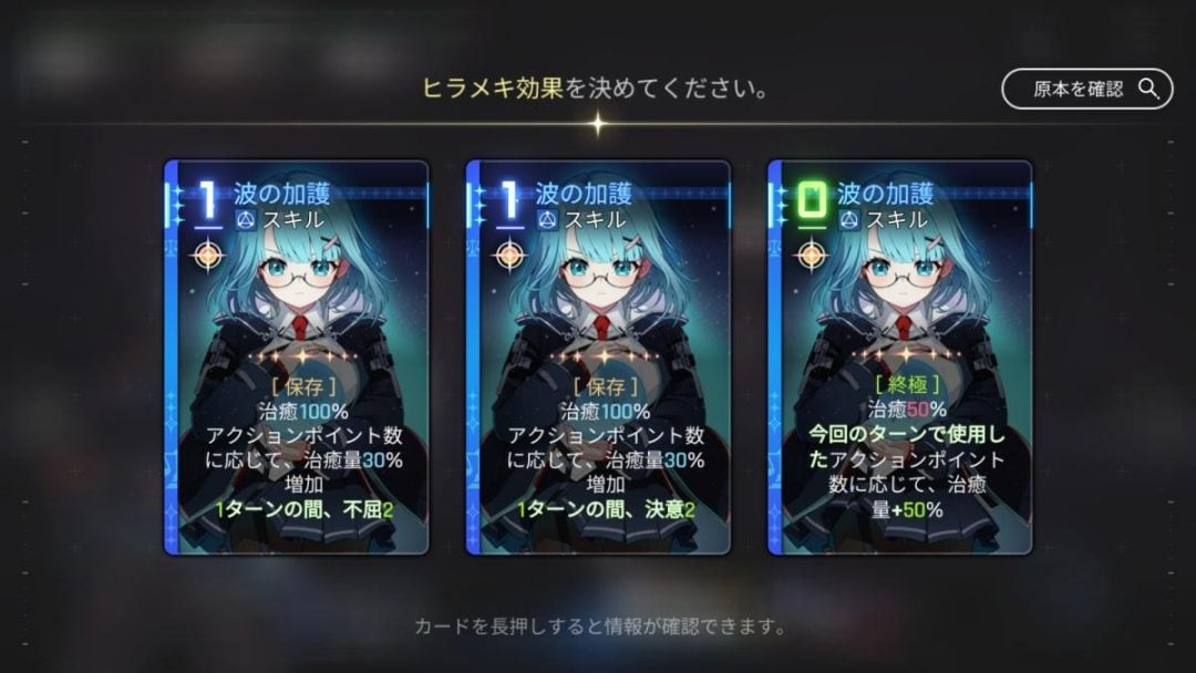 このヒラメキがとにかく気持ちいい。デッキが強くなった頼もしさに加え、ヒラメキで入手したカードはそのターンAP(コスト)なしで使うことができるため、新たに手に入れたカードの効果を早速試せるのが爽快なのだ。特に、ごくまれに起こる「神ヒラメキ」というカードを大幅強化するヒラメキはその演出も相まってか、高揚感が溢れ出す。これによって戦闘が楽しくなるだけでなく、デッキのコンセプトを形付けるため、重要な要素となっているのだ。
