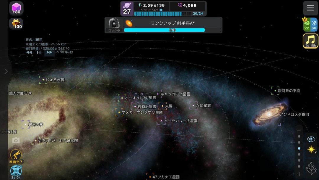 中でも宇宙クリッカーは、太陽から惑星、近隣の恒星や星雲、銀河系から銀河団とアンロックが進んでいき、それらを精緻な宇宙モデルとして拡大縮小しながら見回すことができる。太陽がちっぽけな存在になっていく宇宙モデルを見たことがある人は多いかもしれないが、それを自由に操作できるのだ。しかも自転・公転の早送り機能や最新の解説まで完備され、少しずつアンロックされるので理解度も段違い。幼い頃から宇宙が好きだった筆者はこの宇宙クリッカーに惚れ込み、すべてが4倍速になる月パスに課金した。