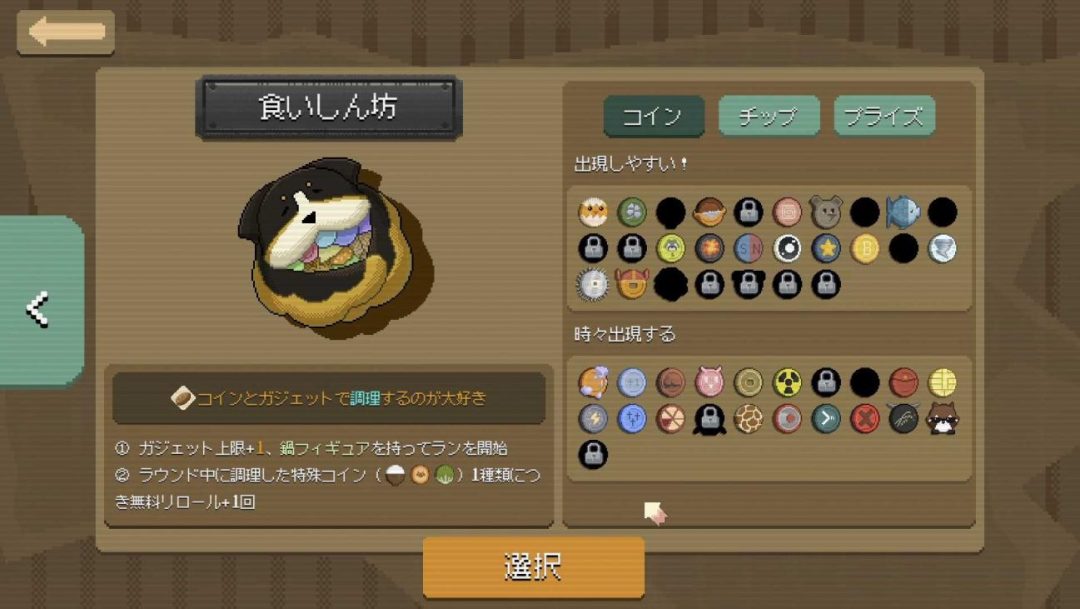 「食いしん坊」というキャラクターは、特定のコイン同士を組み合わせることで、調理して別のコインを生み出す特殊能力を持っている。調理されたコインは価値も高く、強力な効果を持っているので、これらを活用しながらスコアを伸ばしていくことになるだろう。材料となるコインをどうやって増やし、いつ調理するのかのマネジメント力が求められるキャラクターだ。
