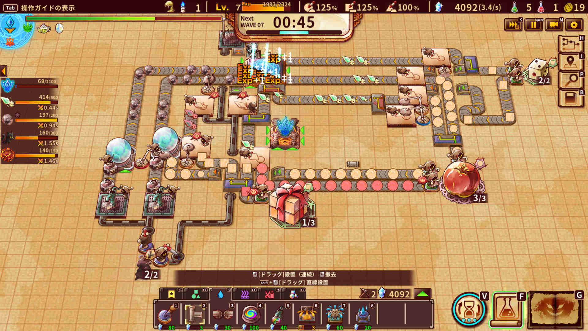 工場を建設できる時間は、1回の戦闘ごとに2分半。制限時間はあるものの、時間の流れを遅くする機能や、一時停止が可能となる「無制限モード」など、システムサポートも豊富。筆者はじっくり考えてベルトコンベアを引くのが好きなので、それなりにやり込んだ今でも無制限モードに設定して遊ぶことが多い。工場建設初心者だけでなく、のんびり遊びたいプレイヤーはぜひ活用していきたい機能だ。