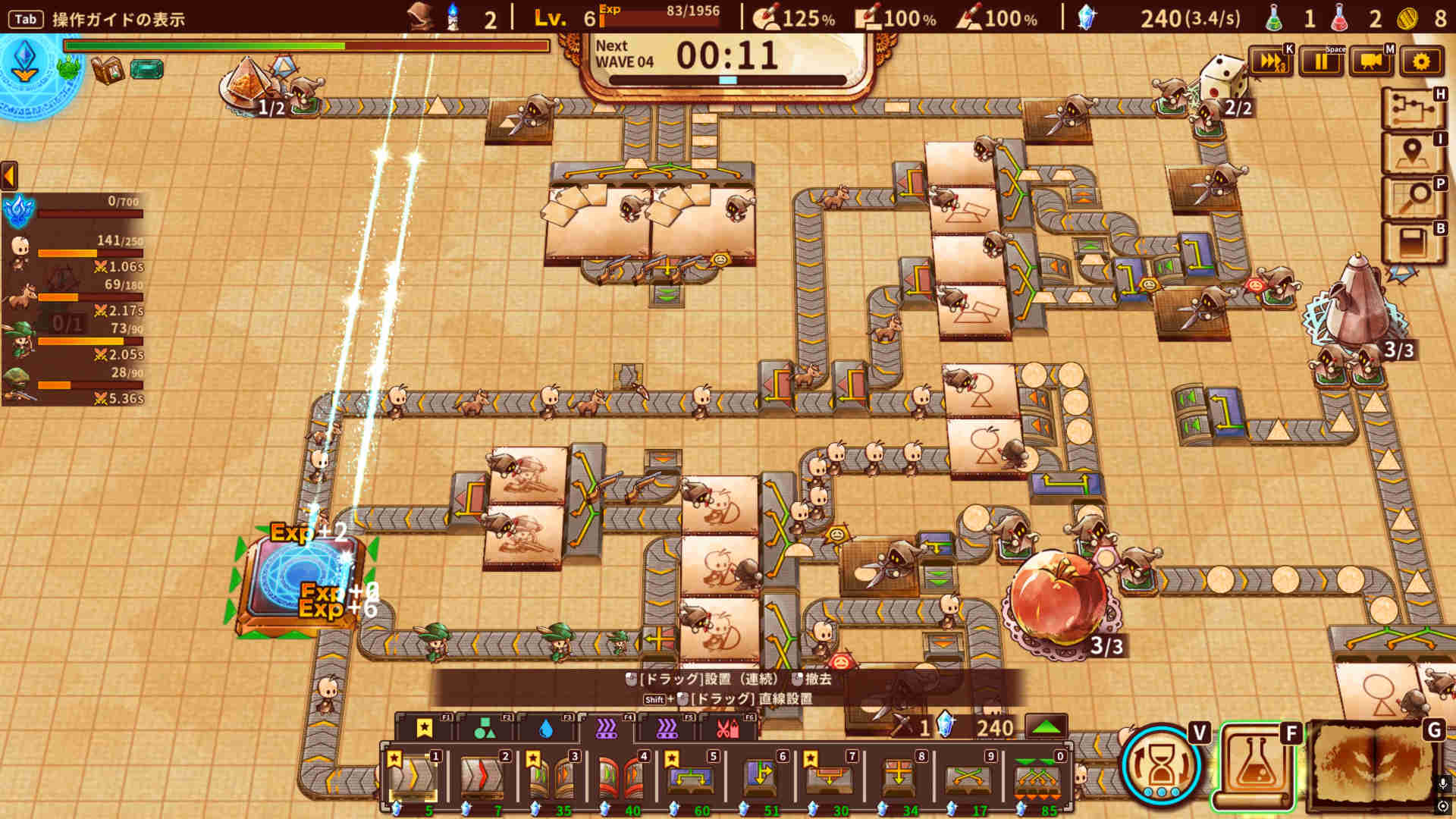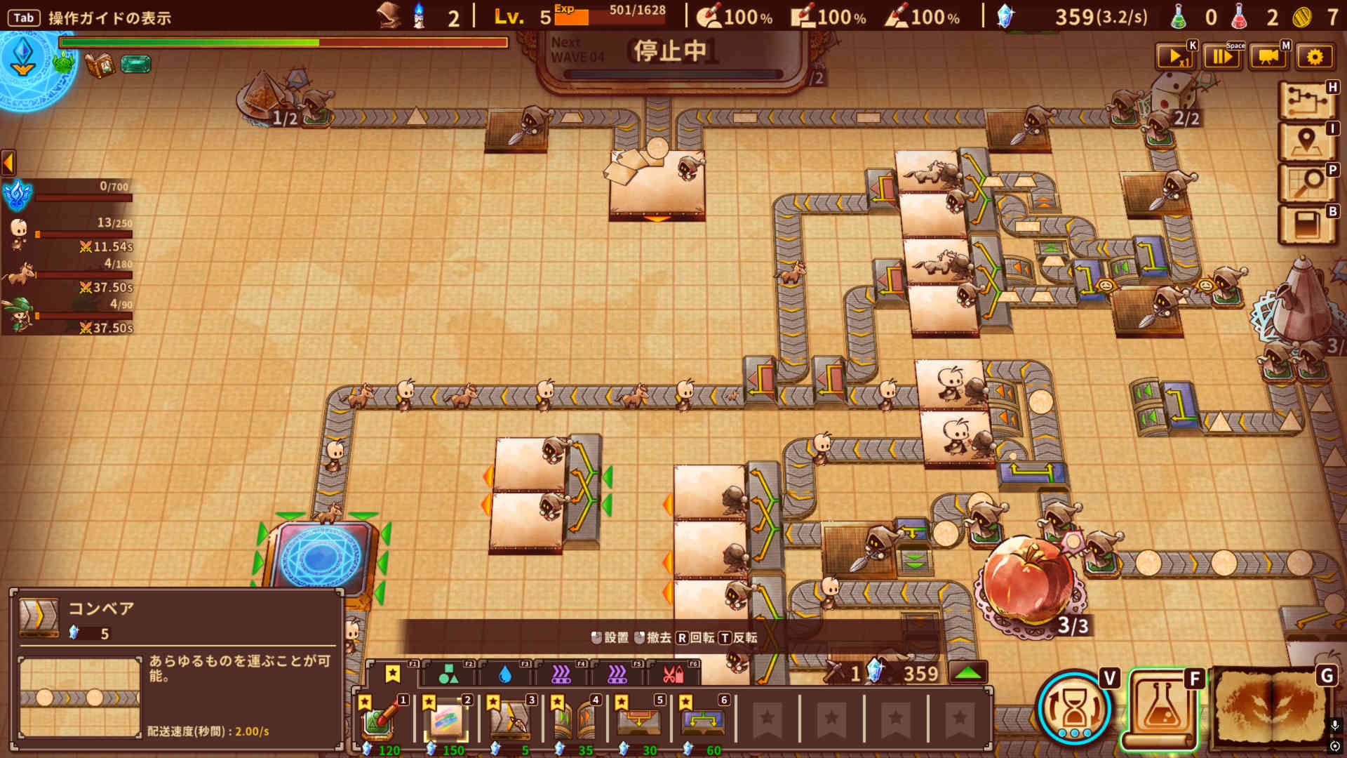 戦のためには、まずは兵を作らなければならない。スクロールの上にはさまざまな図形や色が配置されている。それらをベルトコンベアで設備まで運び、決められたレシピで合成することでユニットを生産するのだ。〇と△を組み合わせると「ヒト」ができ、「ヒト」と□を組み合わせると盾兵になる、といった感じである。レシピは最初に選んだ主人公(マスター)の種類ごとに種別が異なり、周回ごとにランダムで決まっていく。