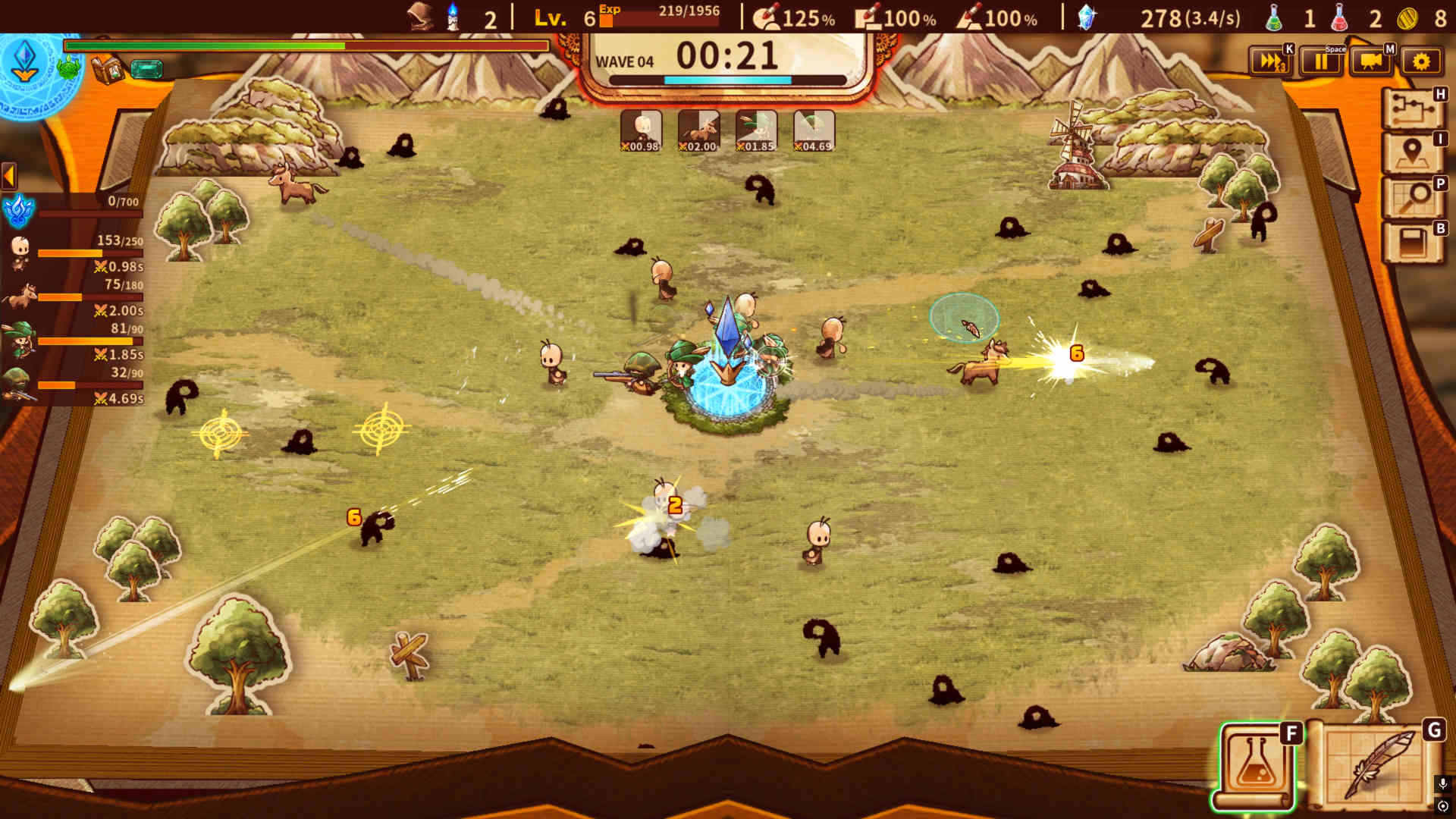 工場建設の時間が終わったら、敵の侵攻から拠点を守るタワーディフェンスの時間がやってくる。3分のあいだ拠点を守りきれば、次のステージに進めるというわけだ。戦闘は基本的に自動で進んでいくが、選んだ主人公の特性によって介入度合いが変わる。慣れないうちは手動操作の少なくて済む「ミニオンマスター」がおすすめだ。