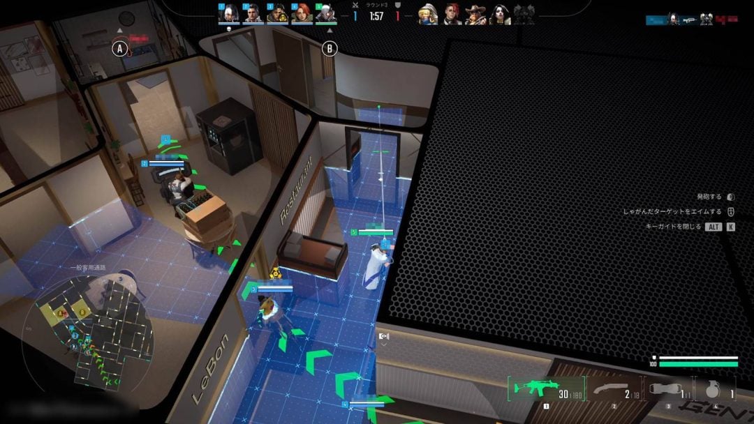 そして試合はラウンド制となっており、3戦ごとに攻撃側と防御側が交代。先に4勝したチームがマッチの勝者となる。防御側は一足早く戦場にスポーンでき、30秒間用意されている準備フェーズから行動可能。ドアや窓にバリケードを設置して敵の侵入を困難にしたり、エージェントごとに用意されているガジェットを配置したりする。30秒経つと攻撃チームが行動を始めるため、迎え撃つことになる。ようするに本作は『レインボーシックス シージ』や『VALORANT』に代表されるような、目標の起動・解除を目指すルールといえる。