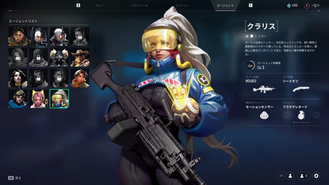 また攻防兼用のエージェントであるクラリスはLMGを持ち、弾幕を張ることが可能。さらに近くを通った敵を検知するモーションセンサーを使用可能で、サブ武器としてソードオフショットガンを持っている。高い火力を有すると同時に索敵・接近戦もこなせるエージェントで、個人的に使いやすかったキャラだ。