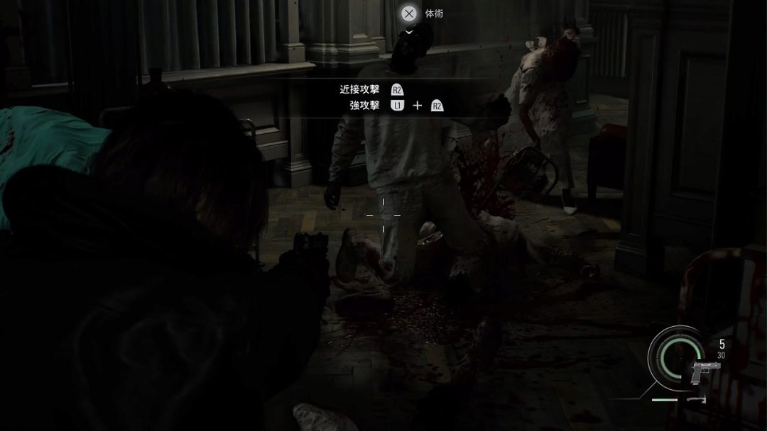 一方、レオンのパートは『バイオハザード RE:4』にて登場したパリィアクションが実質的に無制限利用できるようになった(近接用の斧がその場で修復可能になった)ことに合わせ、ゲームスピードと敵の密度が上昇。とにかく敵を捌き続けるようなアクションを要求される。討伐数に応じて獲得できるクレジットを通じ、武器のカスタマイズも可能。弾薬のクラフト機能を使いながら、近接戦から中距離戦、遠距離戦まで、地形を活かしつつ、さまざまな武器種をつかったマルチレンジでの高速戦闘にプレイヤーが対応できるようになる、という形で、敵が押し寄せる恐怖から、スムーズに敵を処理する爽快感へのシフトが自然に行われる。