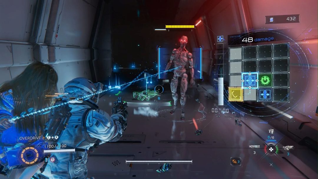 たとえば、敵を足止めする銃を使ってハッキングをしやすくする、弾を当てることでパズルが簡略化される銃を使う、といった連携は可能ではあるものの、互いが何か影響を与え、独特な体験を生んでいるわけではない。プレイヤーのカスタマイズを通じてどちらかに特化できるということは、ゲームの攻略上、両者ともに使う必要性があまりないということでもある。敵の中には特定部位を攻撃することではじめて、パズルの回答が可能になる者もいる。敵を無視して先に進んでも良いロケーションも登場する。開発側としてはこの存在を通して、プレイヤーにリソース管理や戦略を練ってほしいという意図があると思われるが、面倒な敵を見かけたら他のシューティングゲーム同様、逃げ回ってハッキングを行い、射程外から少しずつ攻撃すれば良い。敵の動きが緩慢である都合上、再現性のある攻略法として機能する。高難易度エリアに突入しないかぎり、初期装備である無限リソースの銃を使えば敵をしっかり倒せるため、敵を無視する必要もない。つまり、本作でなければ通用しない戦略を組み立てる必要性は薄い。
